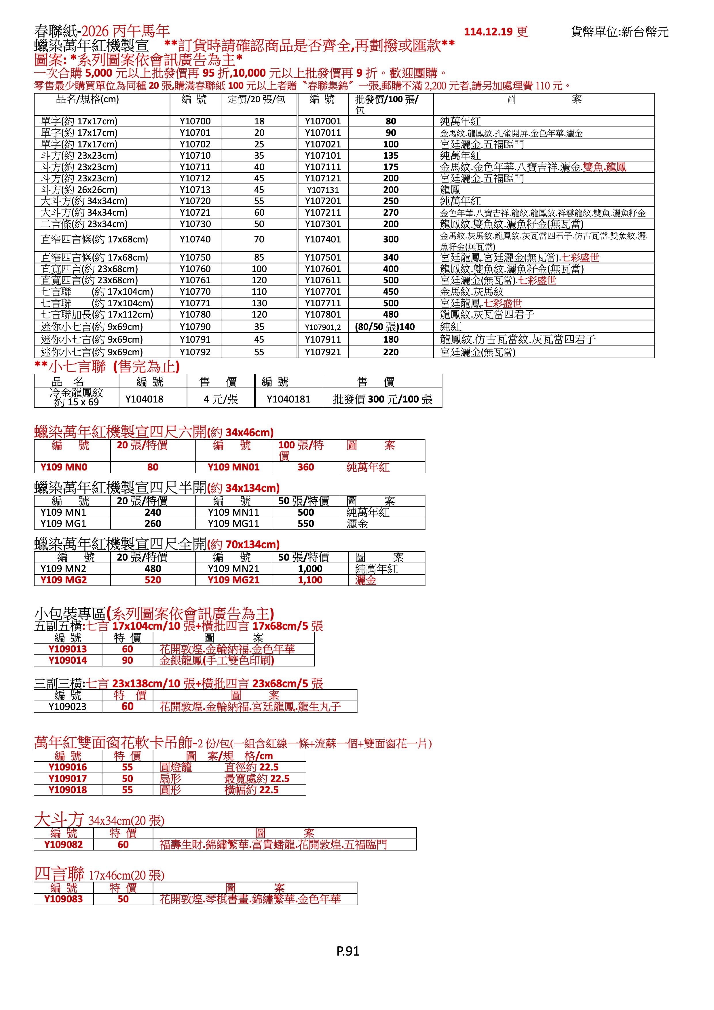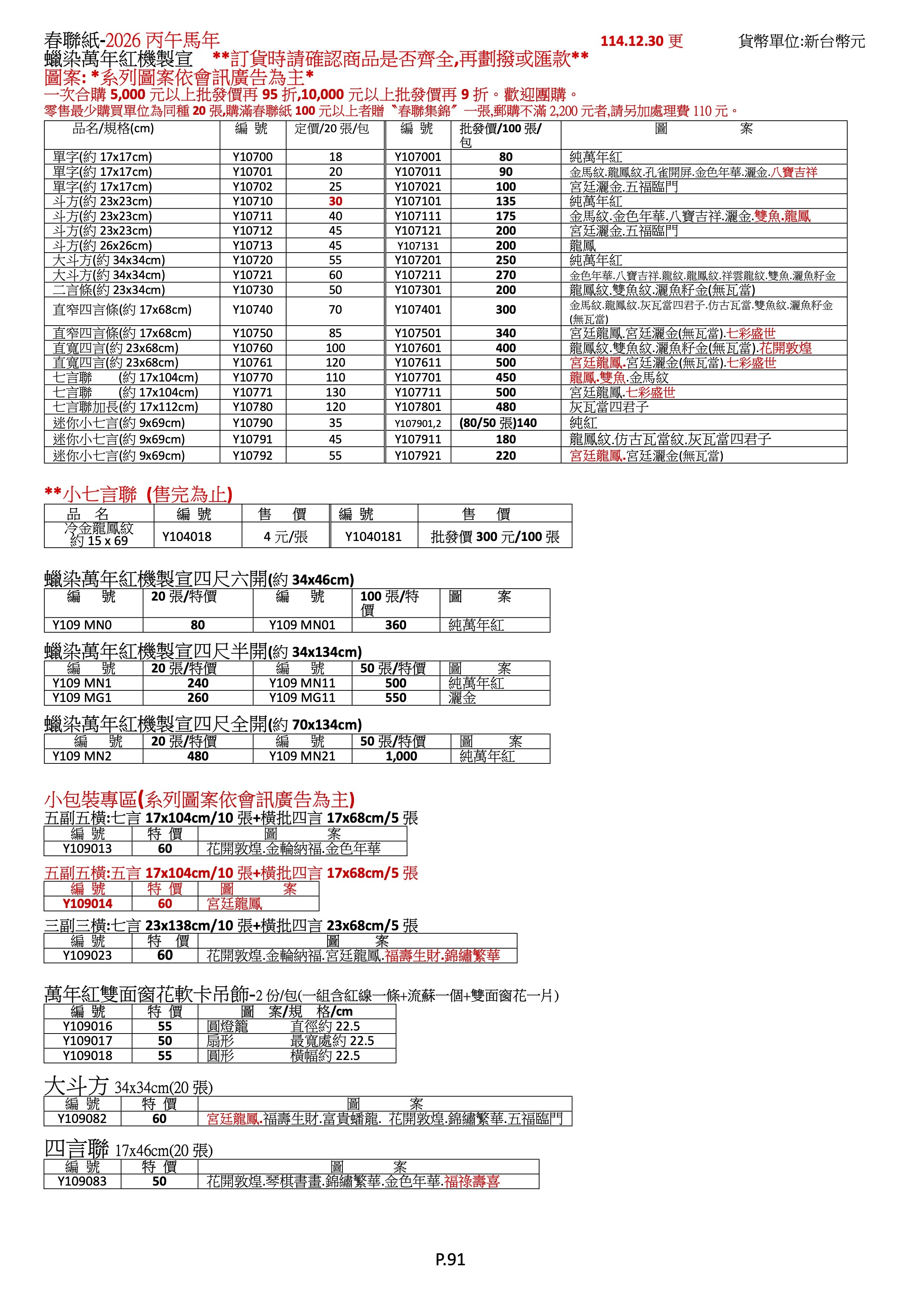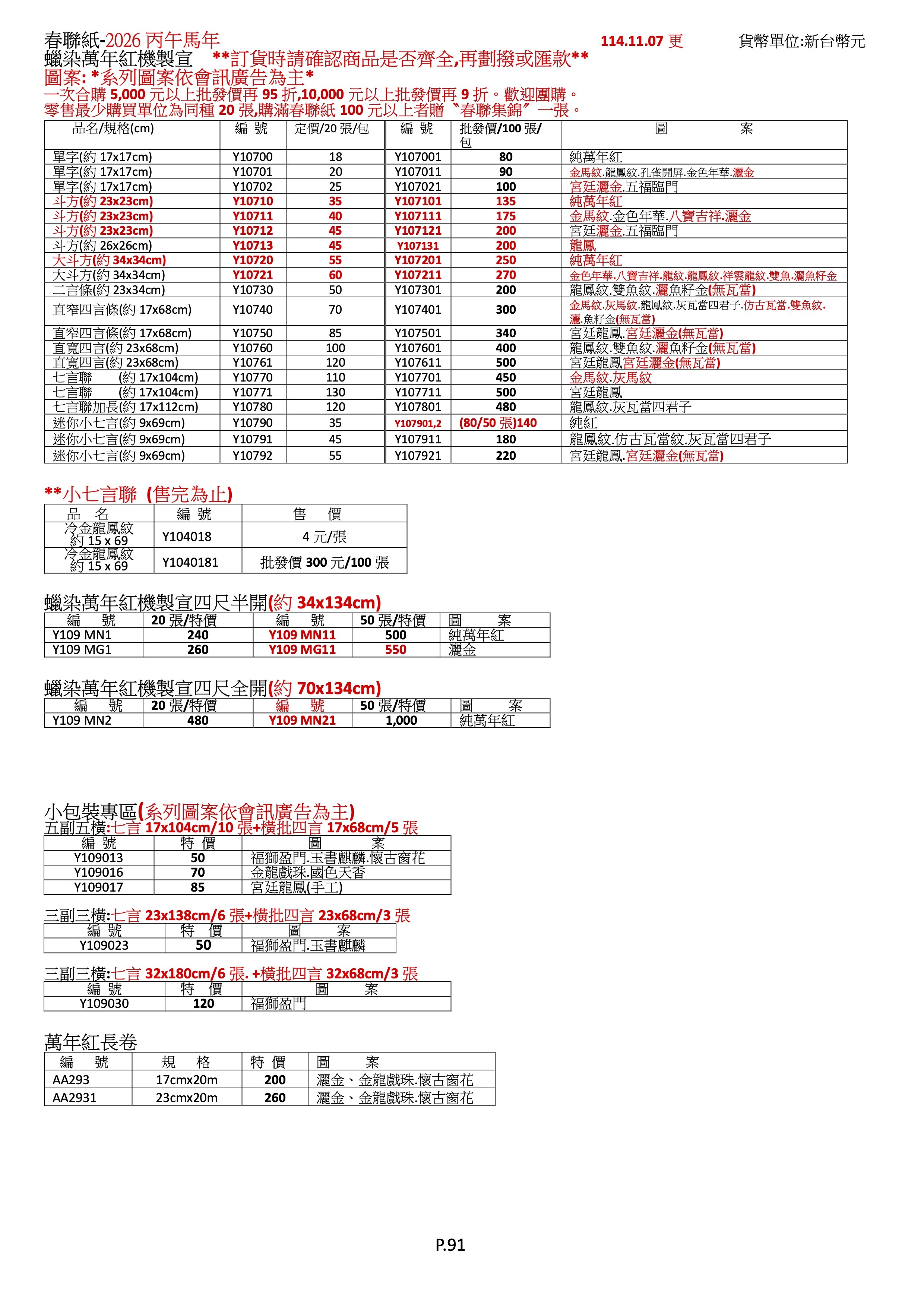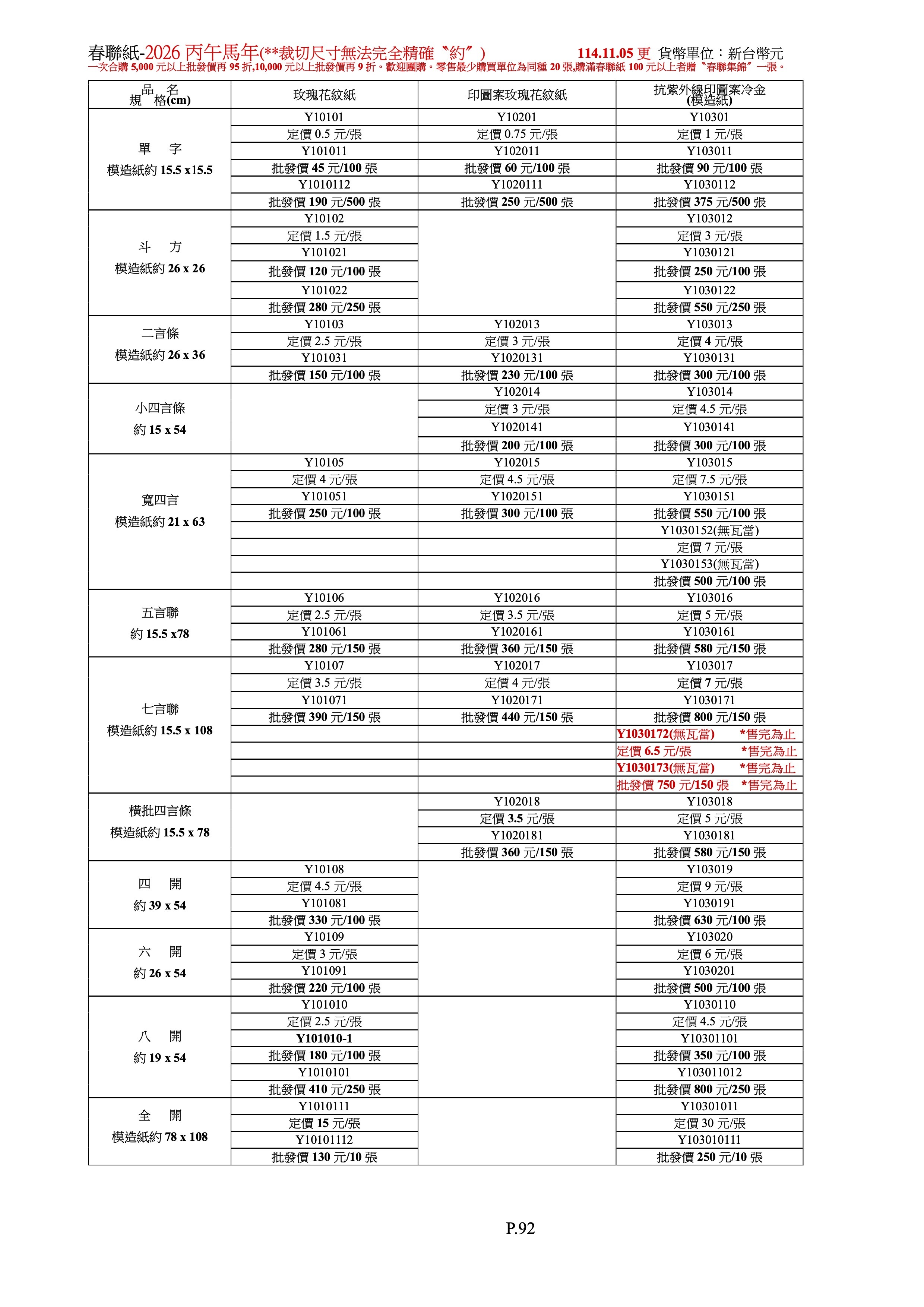 春聯紙:萬年紅冷金手工宣、萬年紅冷金手工印機制宣、模造紙